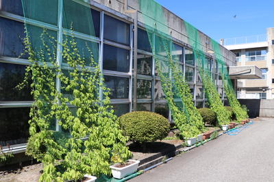 また、食堂の窓のグリーンカーテンのゴーヤもツルを高く伸ばしています。