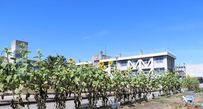 校庭のひまわりが咲き始めました。50m程に渡って植えられているひまわりが大きな花を咲かせています。