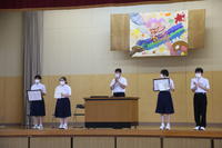 体育館に全校生徒が集まり、校歌斉唱、各学年代表3名から2学期の抱負、校長講話を行いました。
