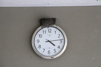 校舎の玄関の時計の上にツバメが巣を作っています。